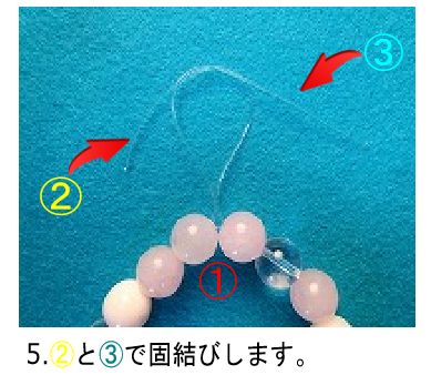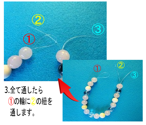 ①の輪の方へ天然石をずらしながら、紐のたるみを取ります。